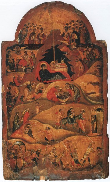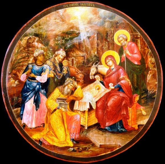В византийской станковой живописи (иконописи) сцена «Поклонение волхвов» вливается в композицию «Рождество Христово» как один из изображаемых эпизодов. Хронологически поклонение волхвов состоялось несколько позднее поклонения пастухов, тогда, когда святое семейство уже разместилось в одном из домов Вифлеема. Но в христианском искусстве допускается совмещение разновременных событий в одной композиции. Для ясного выражения богословского смысла происходящего некоторые формальные детали могут не акцентироваться или даже игнорироваться.