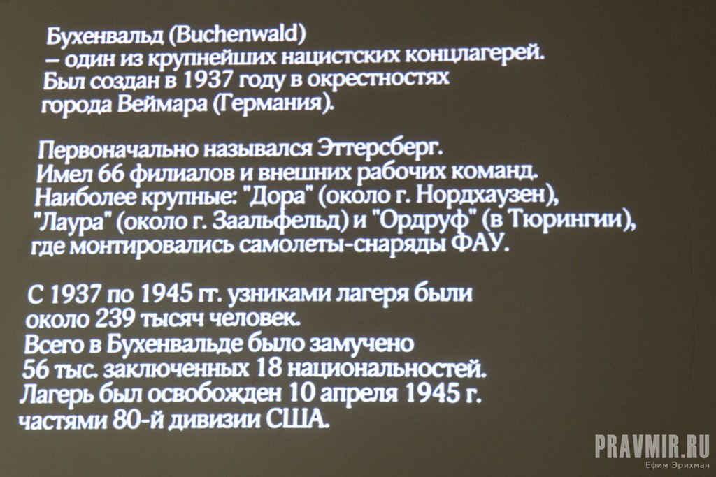 С 1937 по 1945 гг. узниками лагеря Бухенвальд были около 239 тысяч человек. Всего в Бухенвальде было замучено 56 тысяч заключенных 18 национальностей.