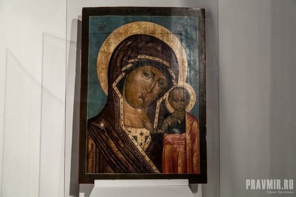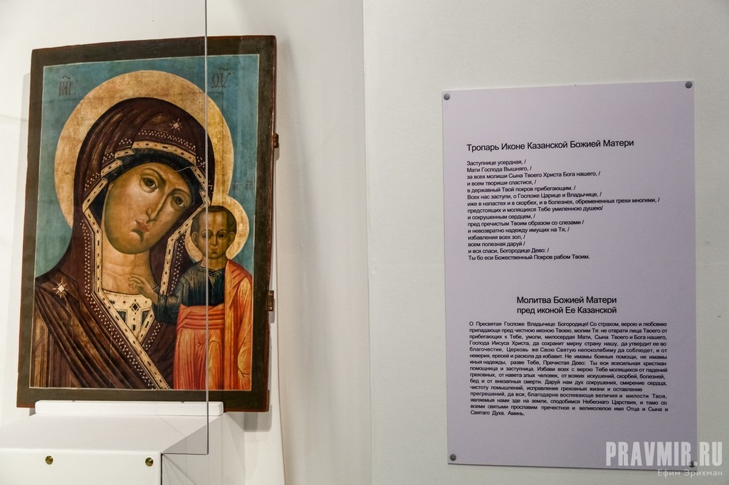 Казанская икона Божией Матери. Последняя четверть XVIII века. Центральная Россия. Первоначальный чудотворный образ Богоматери с Младенцем, именуемый «Казанским», был обретен 8 июля 1579 года во время завоевания Казани войсками Ивана Грозного. Издревле икона почиталась как Заступница и Победительница: именно заступничеству Казанской Богоматери приписывалось окончательное освобождение Москвы от поляков в 1612 году, в 1812 году этот образ был вознесен М.И. Кутузова во время молебна о даровании победы над врагом. Древняя чудотворная святыня была утрачена еще в 1904 году, однако до нас дошли тысячи списков с прославленной иконы, написанные на протяжении столетий в разных уголках России. К их числе относится образ из собрания Музея русской иконы. Стилистические особенности памятника свидетельствуют о его создании в последней четверти XVIII века в одной из иконописных мастерских центральной России. Икона была приобретена в 2006 году в Сергиевом Посаде. Семейное предание сохранило историю этого образа. Известно, что икона была освящена в Троице-Сергиевой Лавре и впоследствии находилась в местном ряду иконостаса одного из сельских храмов, располагавшихся вдоль Ярославской дороги. Во времена правления Александра II (1866-1881) для этого храма был заказан новый иконостас, а образ Богоматери Казанской перешел к бывшему церковному старосте, который привез его в Сергиев Посад, где он и хранился как семейная чтимая икона, переходя из поколения в поколение. Перед этой иконой служили молебны и ей же благословляли призванных в армию в годы Первой мировой войны (1914-1917). Образ охранял членов семьи, в которой находился — все сыновья вернулись домой невредимыми, а один из них будучи унтер-офицером 10-го Новгородского драгунского полка во время Великого отступления русской армии в 1915 году пережил чудесное явление почитаемой в семье иконы. Во время ночного боя он отбился с частью своего разъезда от основных сил полка. Вдруг посреди ночного леса ему явился с детства знакомый образ Казанской Богоматери, словно парящий в воздухе и овеянный чудесным светом. Посреди выстрелов и наступавших австрийских частей пятеро драгун во главе с унтером следовали за все отдалявшейся от них иконой. В итоге они смогли прорваться с поля боя и выйти в расположение родной дивизии, буквально наткнувшись на арьергардные части соседнего уланского полка. В годы Великой Отечественной войны во время битвы под Москвой (осенью 1941), икона была вывезена одним из священников в прифронтовую зону, в расположение 33-ей армии. Здесь батюшка будучи на полулегальном положении и следуя негласному дозволению командования, служил молебны о здравии солдат и благополучном исходе сражений. Перед этой же иконой под обстрелом немцев был отслужен открытый молебен, когда части 222-й стрелковой дивизии 33-й армии освободили Верею (19 января 1942). Икона оставалась в Верее, а к осени 1942 года была возвращена в Сергиев Посад, где и хранилась, переходя из рук в руки, но свято сохраняя связанные с ней семейные предания. Разумеется, мы приводим здесь лишь семейное предание, но оно со всей ясностью свидетельствует о святости образа Казанской Богоматери для истории нашего Отечества — ведь перед этими иконами столько раз возносилась материнская молитва о возвращении из боя своих сыновей.
