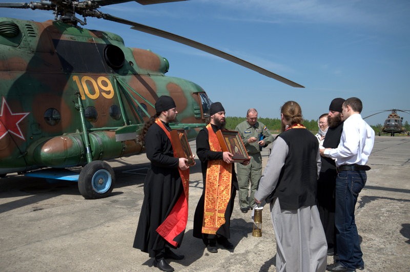 19 мая, ПРАВМИР. В Калужской области впервые прошел воздушный крестный ход. На военном вертолете наместник Свято-Пафнутьева Боровского монастыря архимандрит Серафим (Савостьянов) в сопровождении хора братии совершил облет района с чтимыми иконами, Божией Матери Калужской и Преподобного Пафнутия Боровского , и Благодатным огнем.