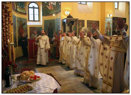 Богородичен: П речистая Мати Божия, Воплощеннаго от Тебе, и от недр Родителя неотступльшаго Бога непрестанно моли, от всякаго обстояния спасти, яже созда.