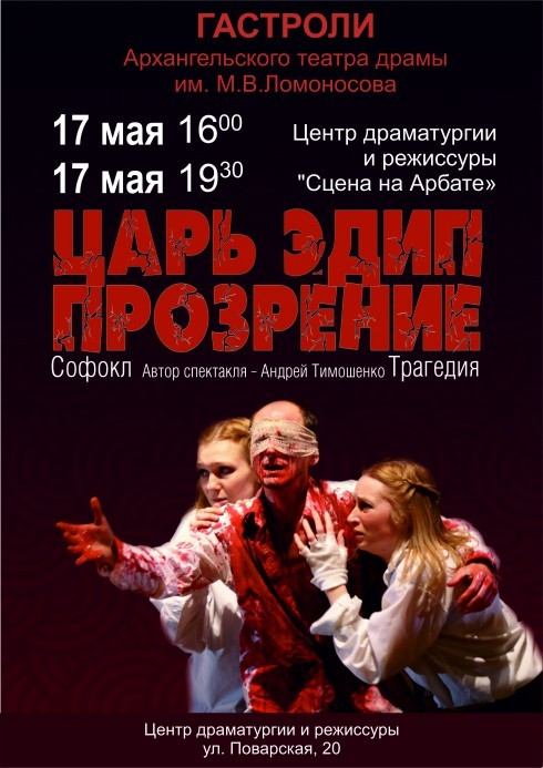 17 мая в 16.00 и 19.30 московским зрителям будет предложен спектакль Архангельского государственного театра драмы им. М.В. Ломоносова «Царь Эдип. Прозрение» по трагедии Софокла. Режиссёр спектакля – Андрей Тимошенко.
