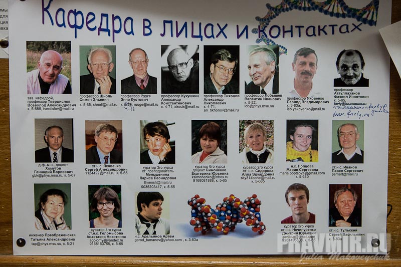 Читал нам лекции и Николай Владимирович Тимофеев-Ресовский, о котором позднее Даниил Гранин написал роман «Зубр» (когда писал, часто приезжал к нам на кафедру), а также многие прекрасные физиологи. До сих пор на нашу кафедру работает 10 кафедр биофака — преподаватели этих кафедр учат биологии будущих биофизиков. Уникально! Для сравнения — на биофаке тоже есть кафедра биофизики, но на нее работает только одна кафедра физфака.