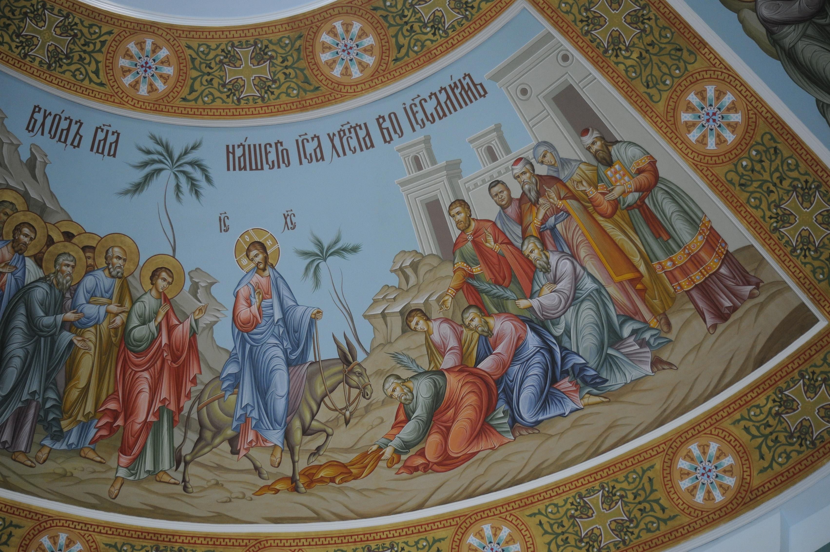 Между тем, в Иерусалиме узнали, что Иисус, воскресивший четверодневного Лазаря, идет в Иерусалим. Множество народа, собравшегося отовсюду к празднику Пасхи, вышло к Нему навстречу. Многие снимали с себя верхние одежды и постилали их Ему по дороге; другие срезали пальмовые ветви, несли их в руках и бросали по дороге. И весь народ, сопровождавший и встречавший Его, в радости восклицал: «осанна (спасение) Сыну Давидову! благословен грядущий во имя Господне (т. е. достоин хвалы, идущий от имени Господа, от Бога посланный) Царь израилев! Осанна в вышних!»