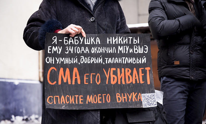 Рядом с колясками стоят две женщины. Они из организации «Мама рядом». Это сообщество матерей детей, больных СМА. Пожилая женщина держит плакат: «Я бабушка Никиты, ему 34 года, он окончил МГУ и ВШЭ. Он умный, добрый, талантливый. СМА его убивает, спасите моего внука».