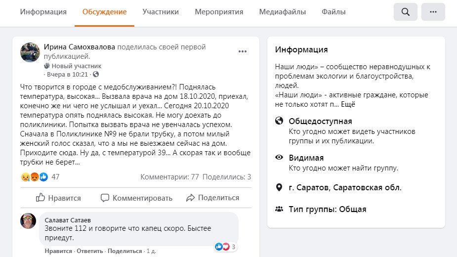 Одно из сообщений в группе «Наши люди Саратов» в соцсети Facebook