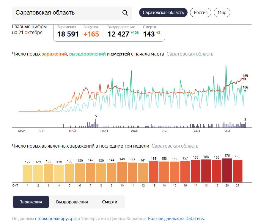 В Саратовской области живет 2,4 миллиона человек. С октября регион практически ежедневно бьет рекорды по количеству пациентов с COVID-19, выявленных за сутки. Произошел скачок со 127 случаев в начале месяца до 176 по состоянию на 20 октября.