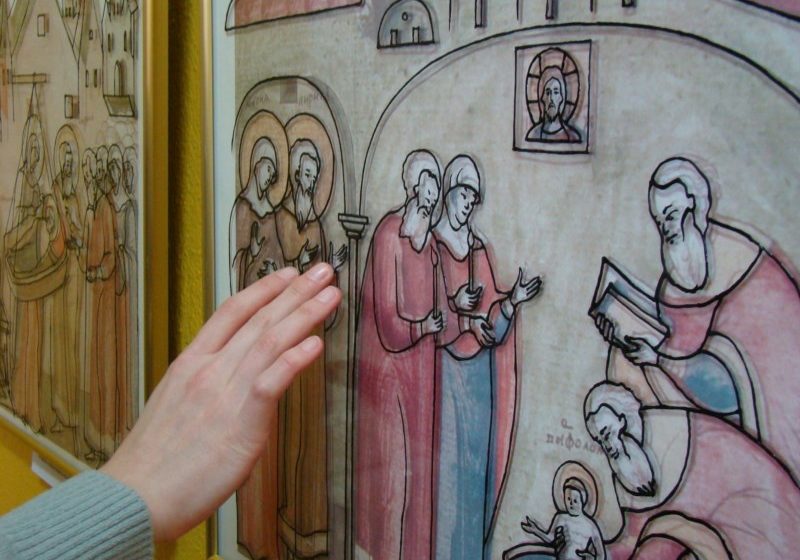 Коллектив художников-волонтеров Церковного музея подготовил тактильные картины для незрячих в технике контурной росписи по стеклу на основе миниатюр лицевого «Жития Сергия Радонежского» и гравюр Татьяны Киселевой.