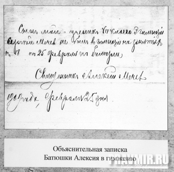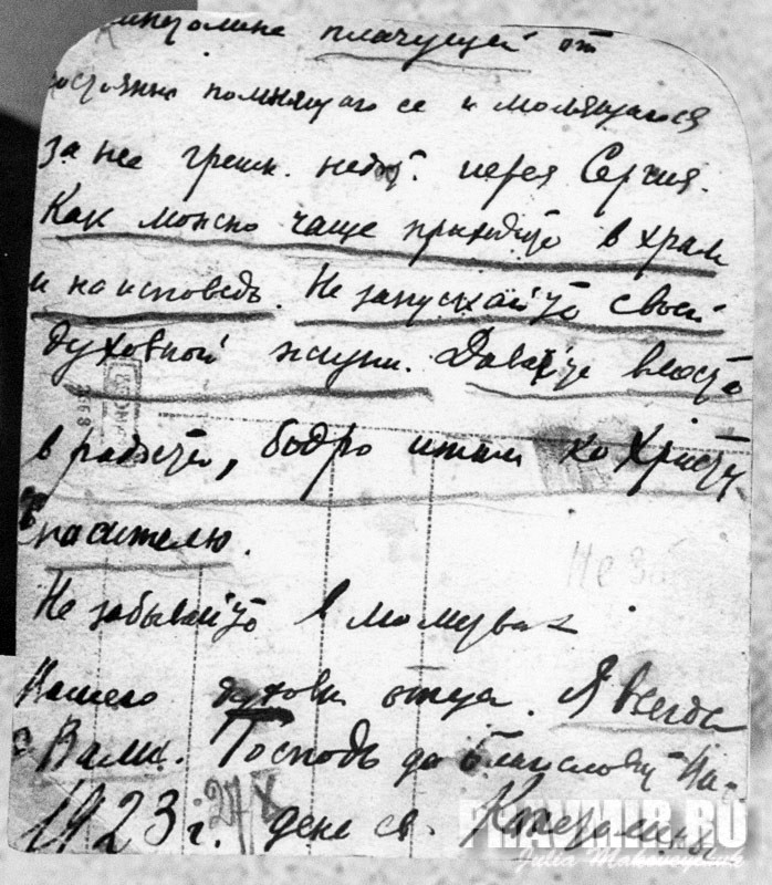 Надпись на обороте фотографии 1923 года. Отец Сергий Мечев. Капитолине плачущей от постоянно помнящаго ее иерея Сергия. Как можно чаще приходите в храм и на исповедь. Не запускайте свой духовной жизни. Давайте вместе в радости идти бодро ко Христу Спасителю.