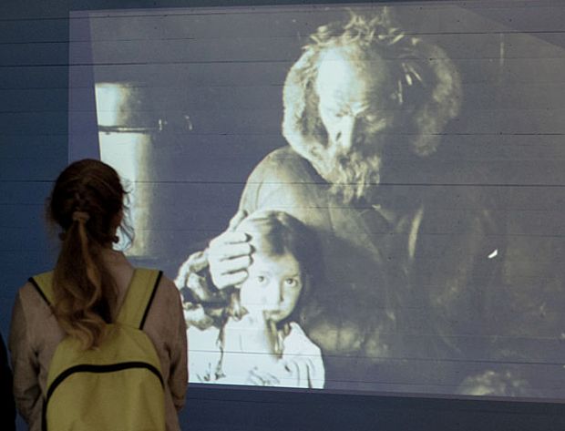 Заходишь в стеклянную дверь Нового манежа, и вдруг – взрыв. На большом белом экране, натянутом сразу напротив входа, взлетает в воздух мирный пейзаж – дерево и трава превращаются в комья земли, разлетаются по белому полотнищу, подкрашенные красным документальные кадры кинохроники открывают выставку «Взгляни в глаза войны».