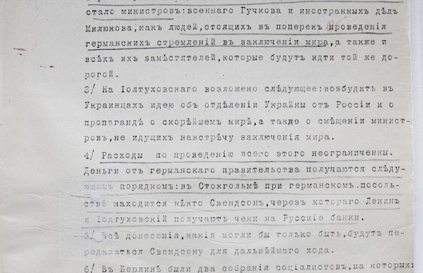 Дополнение к протоколу допроса прапорщика Ермоленко, 10 мая 1917 года «Я командирован в Россию германским правительством с такими же задачами, какие возложены на … также и Ленина, а именно: Ленину поручено пропагандировать мир и стараться всеми силами к подорванию Временному правительству доверия народа … Расходы по проведению всего этого неограниченны. Деньги от гемарского правительства получаются следующим порядком: в Стокгольме при германском посольстве находиться некто Свендсон, через которого Ленин и Иолтуховский получают чеки на Русские банки»