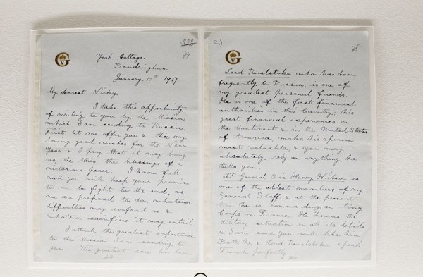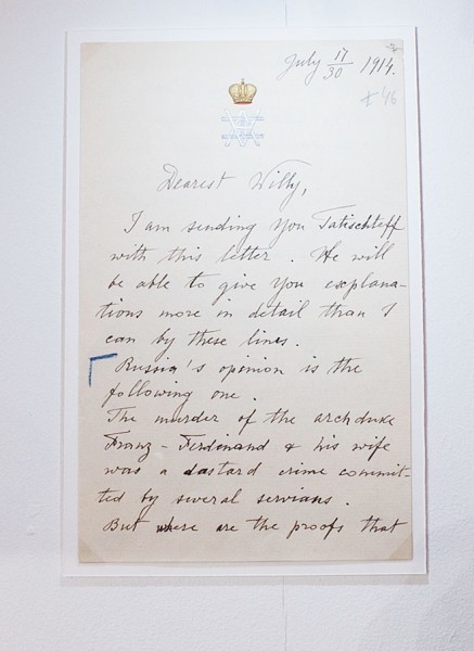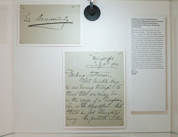 Конверт и письмо императрицы Александр Федоровны вдовствующей императрице Марии Федоровне, находящейся в Лондоне. Петергоф. 16 июля 1914. «Мы сейчас переживаем ужасные дни. Каждую минуту – телеграмма, телефон, — никто не знает, что будет дальше. Вам остается лишь молиться, чтобы этот кошмар прекратился. Слава Богу, что с нами Англия и Франция. И, насколько я знаю, Дания и Бельгия тоже объявили мобилизацию. Но я продолжаю верить в то, что Бог может нам помочь и поможет. Вам, которая так далеко, все это, наверное, неинтересно. А как смотрит на это Джорджи? Если бы только кто-нибудь смог вынести эту проблему на рассмотрение Гаагской конференции, которая как раз должна заниматься подобными вещами. Извини за короткое письмо, но у меня сейчас голова совсем не тем забита. Для меня важно использовать все мою силу и все мое спокойствие для того, чтобы помочь моему любимому Ники».