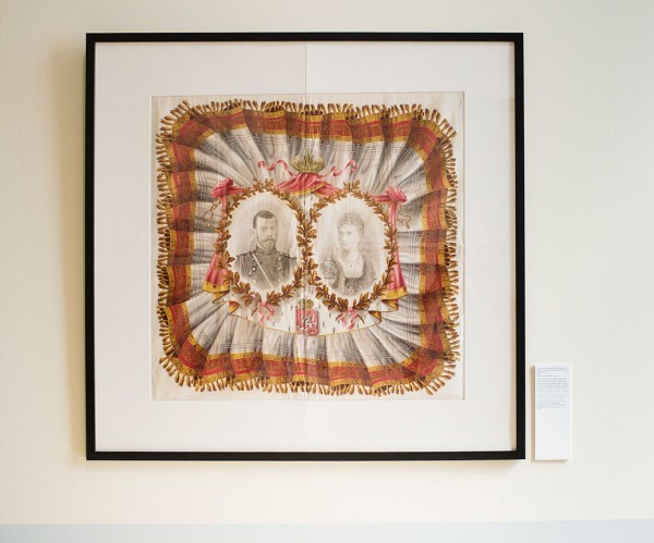 Платок с изображением императора Николая II и императрицы Александры Федоровны, 1896. Платок был специально выпущен московской Прохоровской мануфактурой к коронационным торжествам. В такие платки заворачивали подарки, которые раздавались народу на Ходынском поле. «Каждому посетителю в походных буфетах будет выдаваться платок со сластями, пряником, колбасой, эмалированонной кружкой и программой увеселения. Кроме того, при этом прилагаетмся фунтовая сайка. Для угощения пивом и медом устроены особые буфеты по краям поля» (Из высочайшего объявления о «народном празднике» 18 мая 1896)