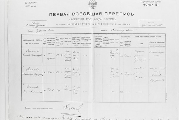 Первая всеобщая перепись населения Российской империи. Переписной лист, собственноручно заполненный императором Николаем II. В графе «занятие, ремесло, промысел, должность» император написал «хозяин Земли Русской». 28 января 1897. По итогам переписи в России насчитывалось 126,4 млн человек (не считая 2,5 млн жителей Великого княжества Финляндского).