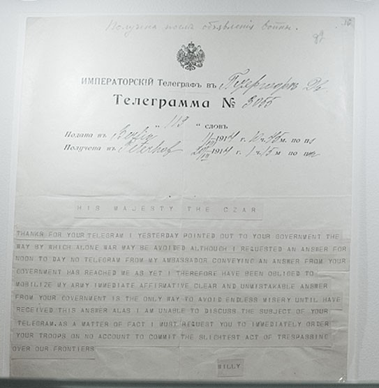Телеграмма кайзера Вильгельма II императору Николаю II. 19 июля (1 августа по н.с.) 1914 год. На бланке: отправлена из Берлина 1 августа 10.45, получена в Петергофе 20 июля в 1.15. «Благодарю за твою телеграмму. Вчера я указал твоему правительству единственный путь, которым можно избежать войны. Несмотря на то, что я потребовал ответа сегодня к полудню, я до сих пор не получил от моего посла телеграммы, содержащий ответ твоего правительства. Ввиду этого я был вынужден мобилизовать свою армию. Немедленный, утвердительный, ясный и недвусмысленный ответ твоего правительства – единственный путь, которым можно избежать неисчислимых бедствий. Пока я не получу это ответа, я, увы, не могу обсуждать твоей телеграммы по существу. Во всяком случае, я должен просить тебя немедленно отдать приказ твоим войскам безусловно воздерживаться от малейшего нарушения наших границ. Вилли» На бланке рукою Николая написано: «Получена после объявления войны».