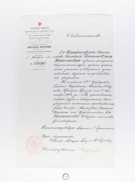 Свидетельство великой княжны Ольги Николаевны об окончании курсов Российского общества Красного креста