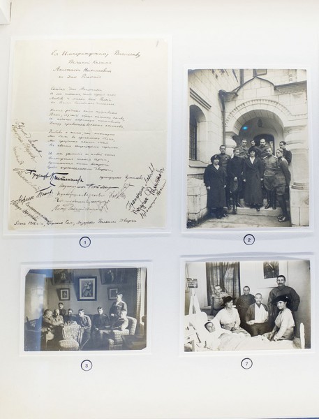 Фотографии, на которых великие княжны Анастасия и Мария сидят в палатах нижних чинов лазарета императрица Александр Федоровны, и стихотворение прапорщика лейб-гвардии Уланского Е.В. Александры Федоровны полка Н.С. Гумилева ко дню рождения великой княжны Анастасии Николаевны. 5 июня 1916 года. Под стихотворением автографы Н.С. Гумилева и других офицеров, находившихся на излечении.