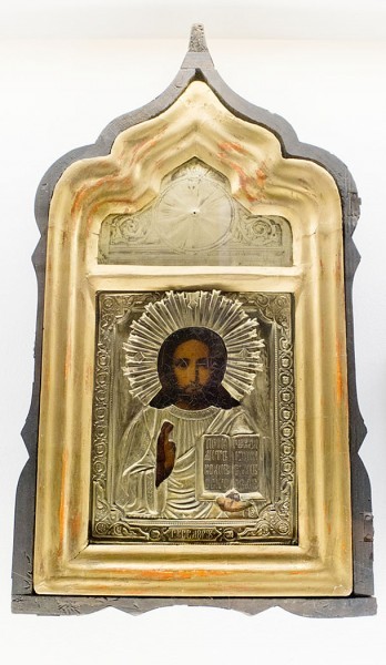 Икона Спас Вседержитель из села Поим. Этой иконой 100 лет назад новобранцев первого и последующего призывов благословили на ратный подвиг. Фотографии некоторых из них представлены в витрине. На оборотной стороне иконы – имена дарителей, тоже воинов. Икона долгое время находилась в церкви, а в 1930 году, когда церкви в селе Поим были закрыты и разграблены, икона была спрятана на чердаке одного из зданий поимской больницы, где и была найдена совсем недавно.