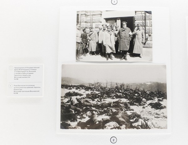 В двух залах представлено около 500 подлинных документов той эпохи: это и переписка последнего Российского императора Николая II и кайзера Германии Вильгельма, это личные дневники, письма, отчеты и графики роста производства оружия, а в соседней витрине – роста холеры и тифа. Старые фотоальбомы, принадлежавшие членам царской семьи, в которые вклеены маленькие снимки: вот в гамаке качается сестра милосердия, вот стол с самоваром, а рядом – раненые, перевязки, коллективные портреты в госпиталях.