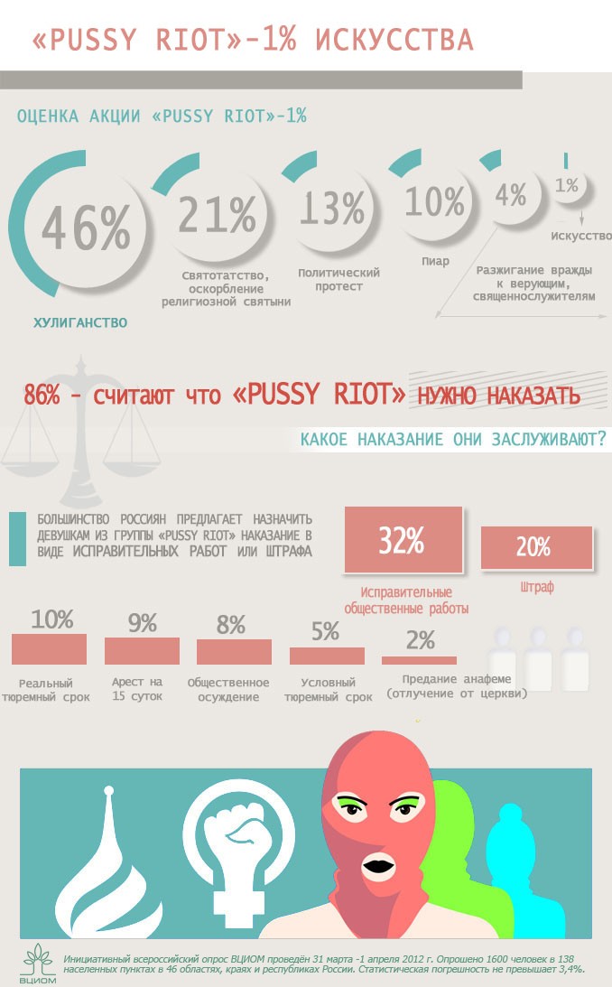 Всероссийский центр изучения общественного мнения (ВЦИОМ) представляет данные о том, как россияне оценивают «панк-молебен» группы «Pussy Riot» и как, по мнению респондентов, следует наказать девушек за эту акцию.