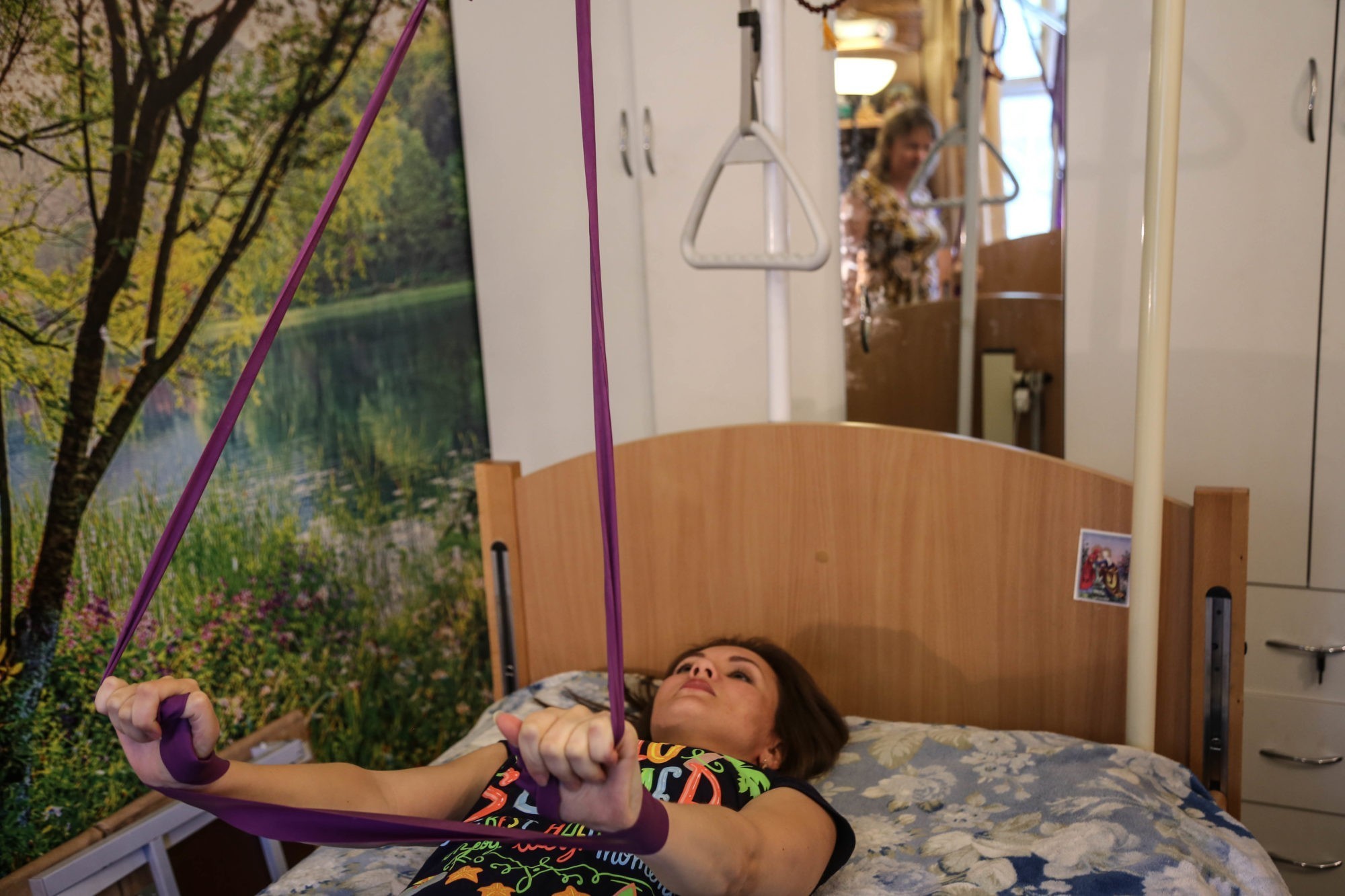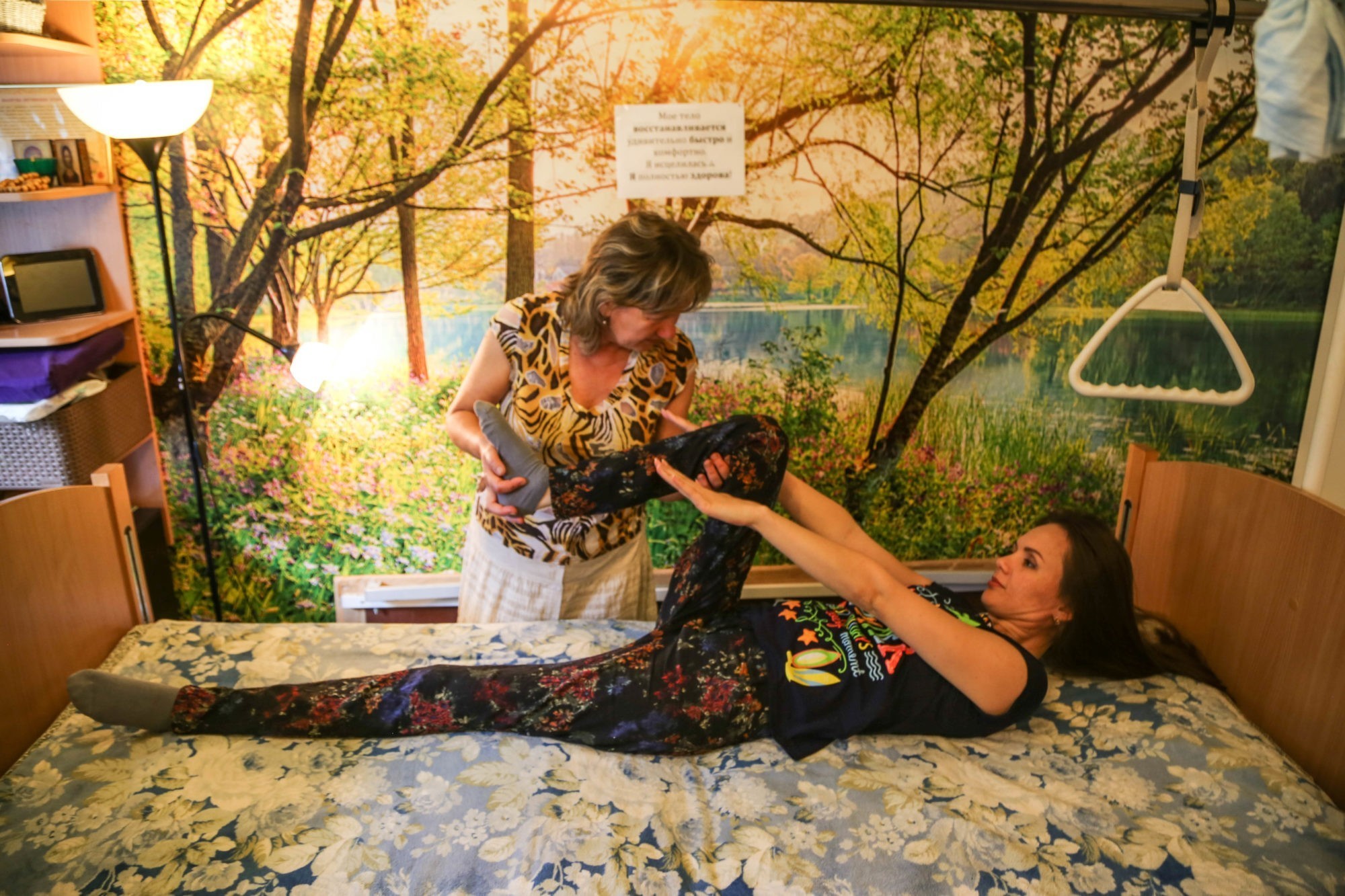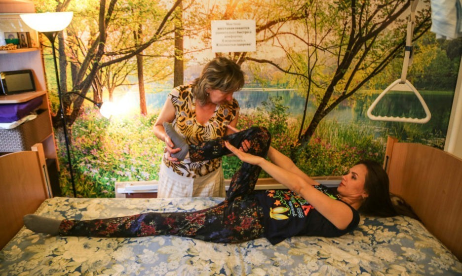 Люба лежит на кровати для реабилитации, ей важно не сбиться со счету, но это не мешает общению. Прошел час. Лариса, ее мама, и сама занимается в этом процессе физкультурой: