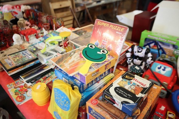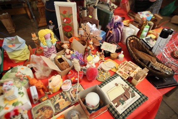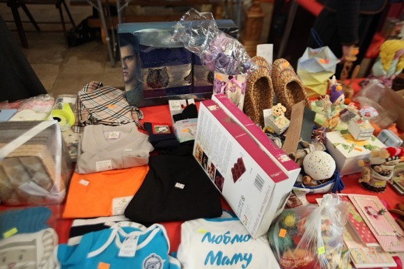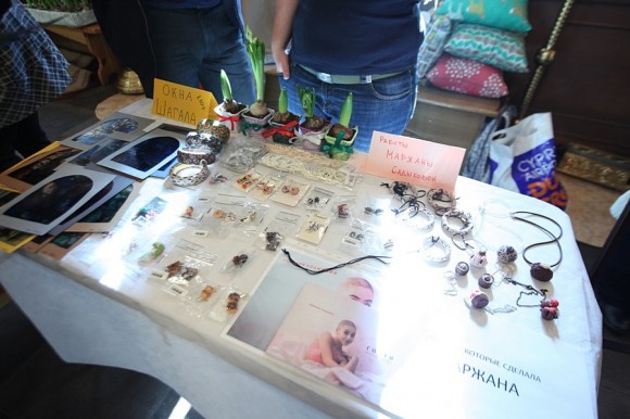 После аукциона все отправились на улицу, где, собственно, развернулась сама ярмарка. Там можно было выбрать себе покупку, что называется, по интересам. Было два стола вещей, сделанных своими руками.