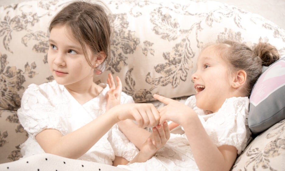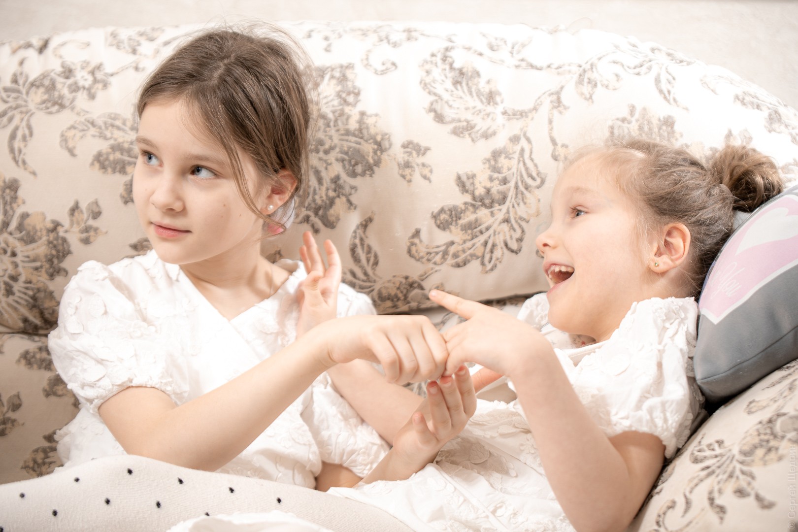 В белом платье, как у принцессы, она сидит, опираясь на подлокотник дивана, ее ноги лежат на коленях у сестры, а голова наклонена вправо. Я неловко спрашиваю у Ани, пойдет ли она ко мне на руки. Девочка хитро смотрит в сторону и что-то едва шепчет. Стесняется?