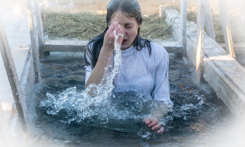 Быстро раздеваемся и, подбадривая себя криками: «Во имя Отца, и Сына, и Святого Духа!», всей толпой бросаемся в воду. Окунуться надо трижды, с головой. Ледяная вода приводит в состояние какой-то взвинченной эйфории, но когда вылезаем на берег, нас ждет новый «сюрприз»: оказывается, вытираться нельзя, сразу одеваться — тоже. Надо еще вылить на себя три ведра воды, которая течет тоненькой струйкой из какой-то трубы…