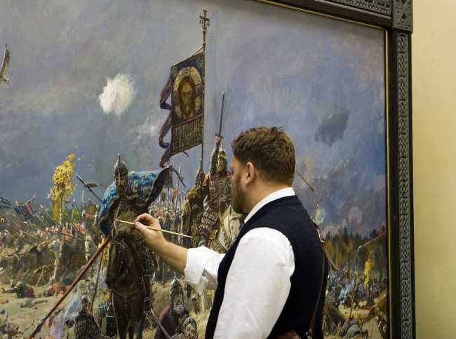 «Ты на холсте говоришь зрителю: «я такое же животное, как и ты, но я это честно признаю. Давай посмотрим, как жили не животные. Давай посмотрим, как жил Донской»… Причем с трепетом. Давай попробуем себе представить, как он жил: его утро, его день, его битва, что он терял в результате этой битвы. Вот он сидит и думает: у него есть любимый сын, у него супруга, которую он обожает. Он все теряет. И что, скорее всего, так и будет и что вся надежда – на Сергия Радонежского. А теперь давайте попробуем представить, кто такой Сергий. Вот это и есть работа со своей душой. Не мои картины. Мои картины, хотелось бы надеяться, – всего лишь толчок к тому, чтобы человек сам дальше шел по лабиринту этих мыслей. И чтобы эти лабиринты выводили бы его на прямую дорогу». («Честный разговор с самим собой». Русский мир, 16 марта 2011 г.)