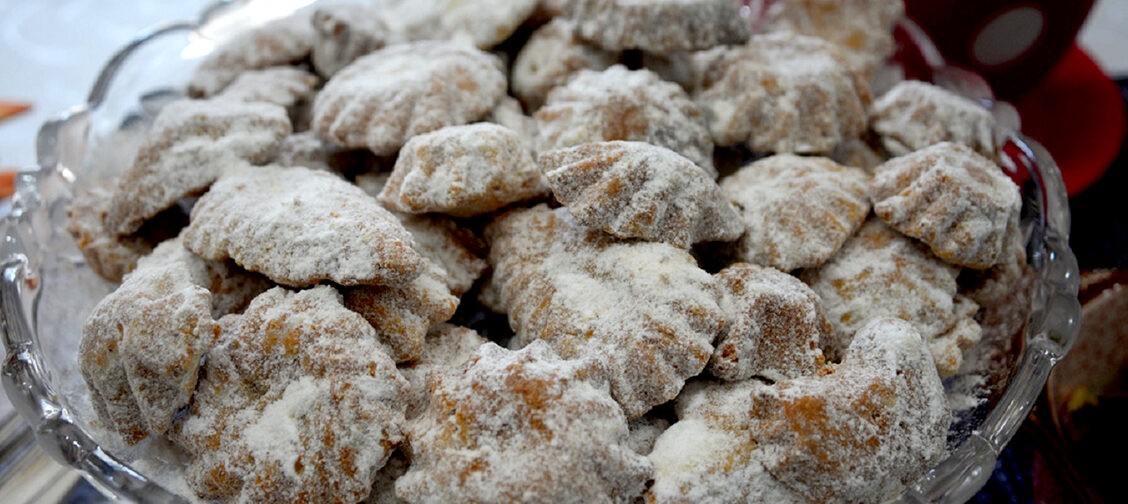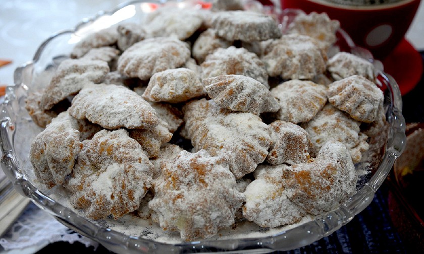 250 г свиного жира, 250 г молотых грецких орехов, 250 г сахарной пудры, 3 яйца, 500 г муки, формочки.