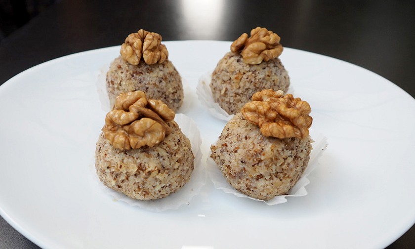 Добавьте молотые грецкие орехи, ваниль или ванильный сахар, мускатный орех и сахарную пудру. Вымесите руками, как тесто.