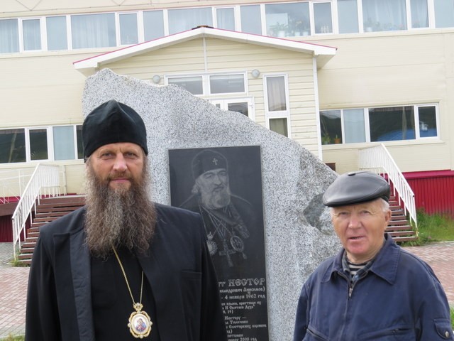 На площади Новых Тиличик. Епископ Артемий и Валентин Мягких у мемориальной доски митрополиту Нестору