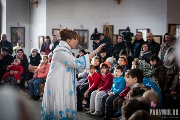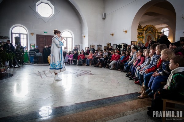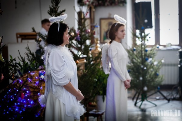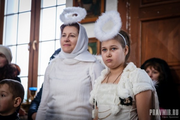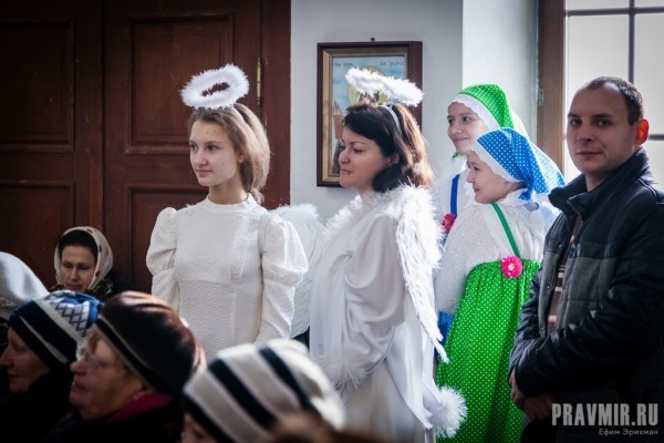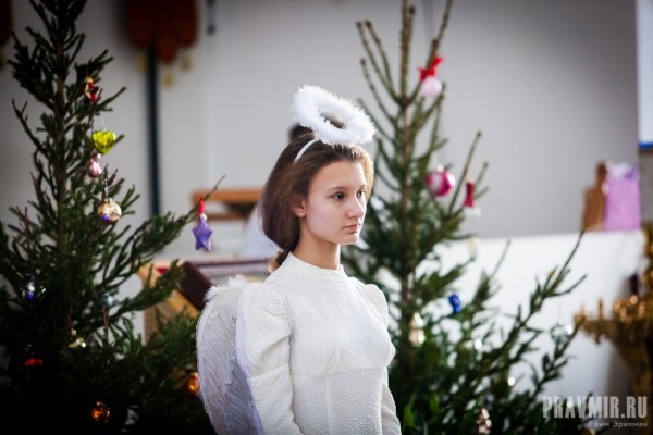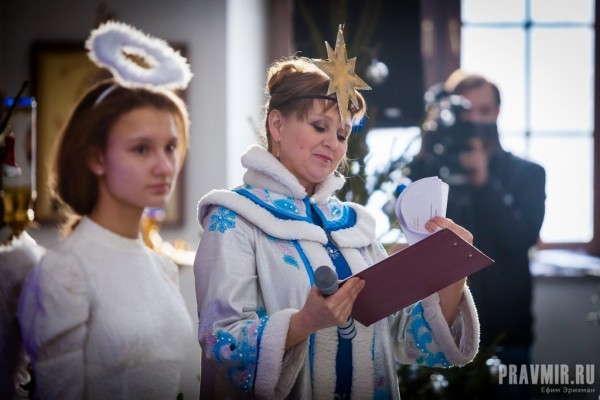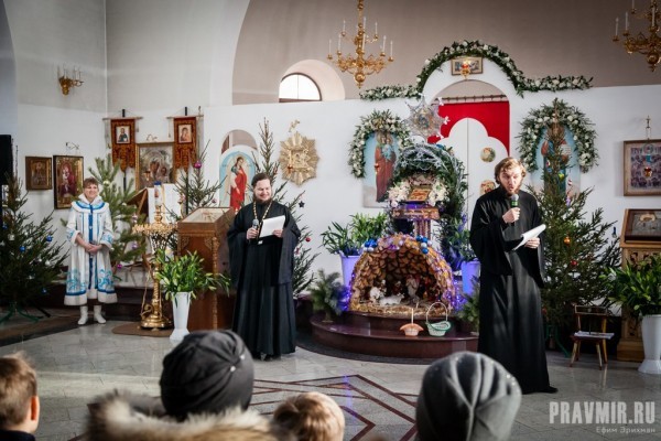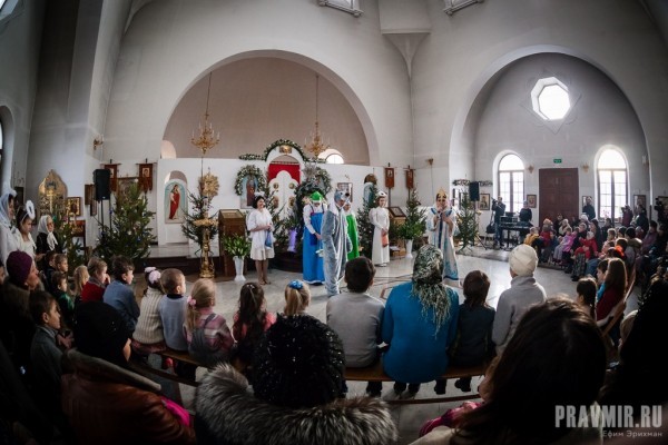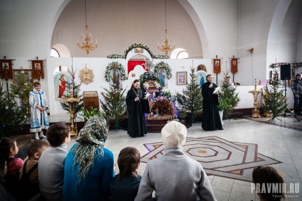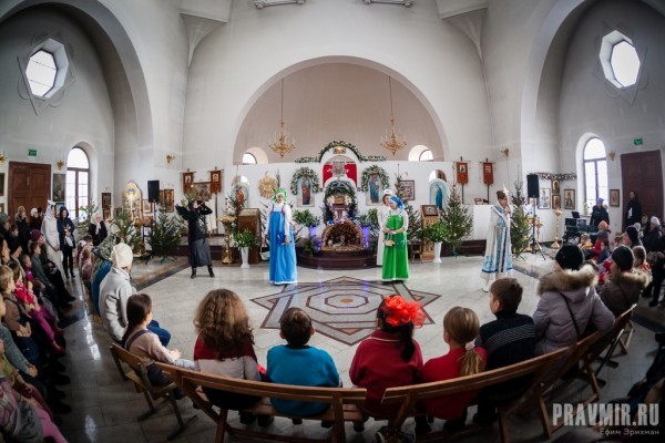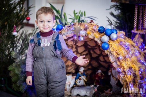 Подарки, конкурсы, загадки, выставка, иллюстрирующая события Рождества Христова, а также спектакль у рождественского вертепа — елка проходила в храме. Полукругом, на низеньких скамейках расселись дети – в основном малыши от трех до семи лет.