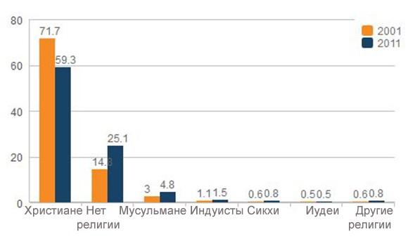 Официально Великобритания является христианской страной, королева страны считается главой англиканской церкви. Однако результаты переписи показывают, что огромное количество британцев отходит от христианства, и число граждан, которые отмечают графу «религия» словом «нет», растет.