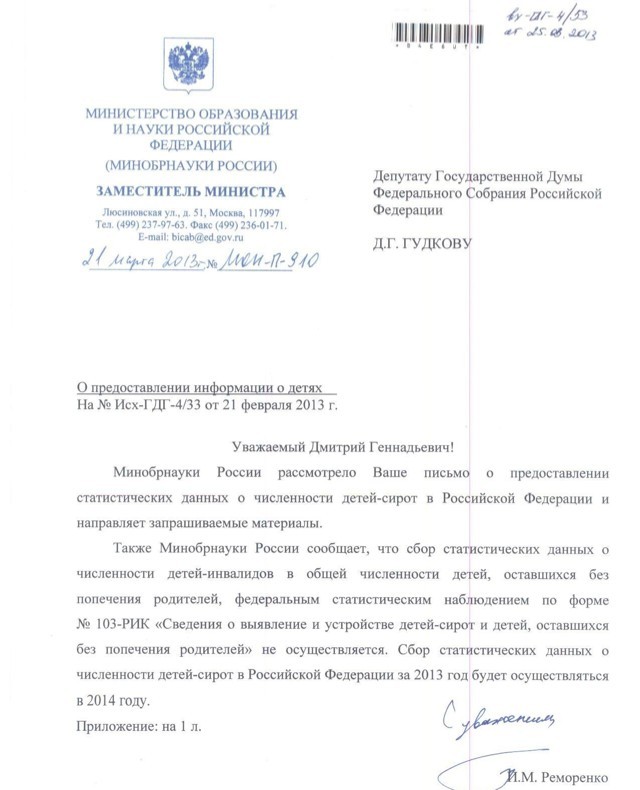26 марта. ПРАВМИР. Депутат Госдумы РФ Дмитрий Гудков запросил статистику по детям-сиротам в России. В своем блоге он привел первый ответ из министерства: