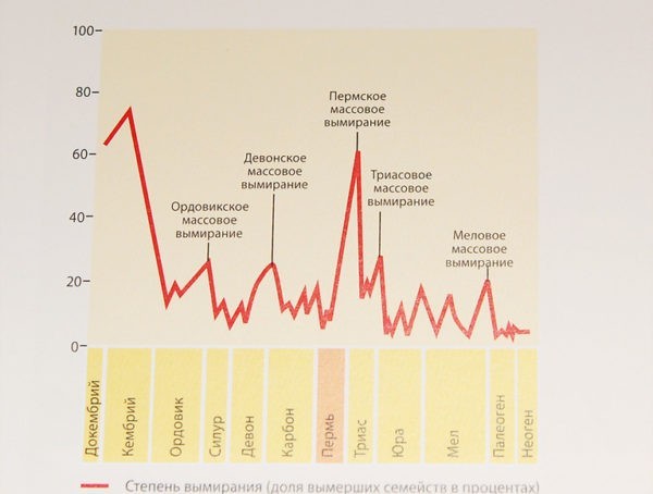 Первое из них произошло в конце ордовикского периода, примерно 450 миллионов лет назад, когда жизнь на планете в основном происходила под водой. Наиболее чудовищное вымирание случилось в конце пермского периода, около 250 миллионов лет назад, и оно чуть не привело к полному исчезновению жизни на Земле (иногда это событие называют «матерью массовых вымираний» или «великим умиранием»).