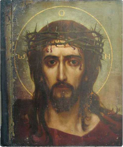 Там же грубая рука раба, изощряясь в жестокости, водрузила на главу Христа терновый венец, придавила его так, что колючки вонзились… Ни слова не произнесли уста Страдальца, только еще более побледнел измученный лик, а по щекам потекли слезы, смешиваясь с каплями крови…