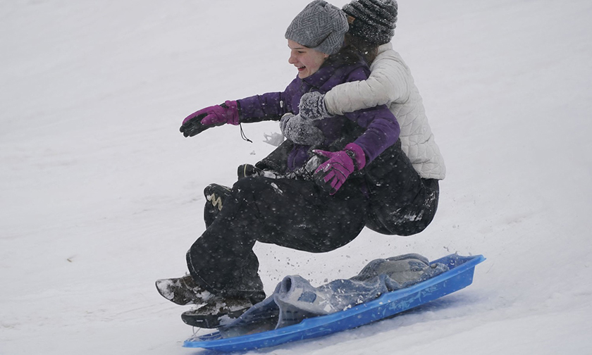 Отэм Сандерс (слева) и Эвери Абате взлетают в воздух, спускаясь с холма в городе Солон, Огайо (США). 20 января 2022 года. Фото: Tony Dejak / AP Photo