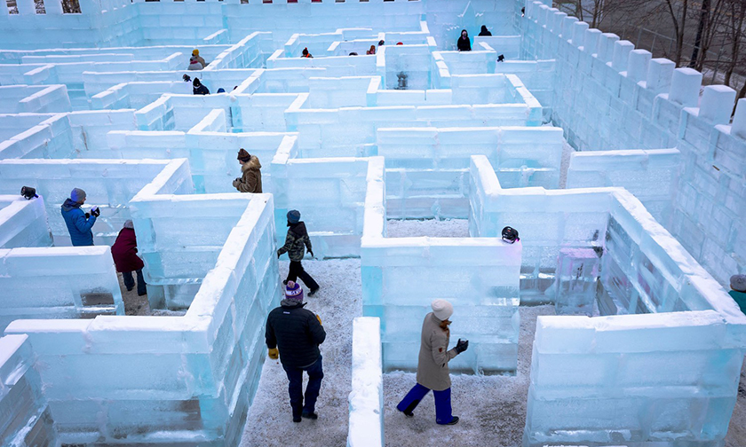 Люди гуляют по лабиринту Ледового дворца в Стиллуотере, Миннесота (США). Этот ледяной лабиринт театра «Зефир» известен как самый большой в Соединенных Штатах. Для строительства потребовалось 10 742 квадратных фута льда в 2 900 блоках и более 3 000 многоцветных светодиодов. 21 января 2022 года. Фото: Kerem Yucel / AFP