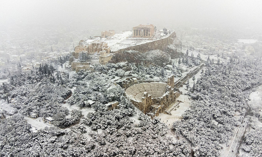 Храм Парфенон во время сильного снегопада в Афинах, Греция. 24 января 2022 года. Фото: Alkis Konstantinidis / REUTERS