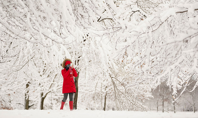 Женщина фотографирует снегопад во время прогулки по Национальной аллее в Вашингтоне, США. 3 января 2022 года. Фото: Kevin Lamarque / REUTERS