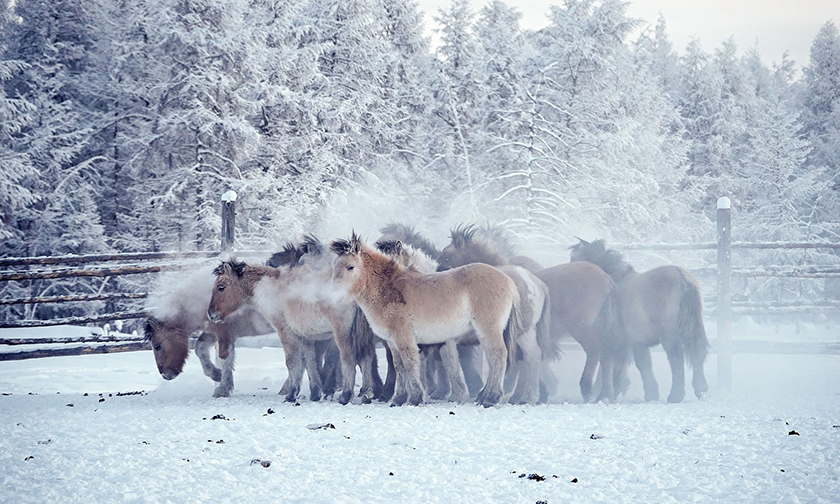 Иней покрывает якутских лошадей — температура воздуха упала ниже 60 градусов. Оймякон, 24 декабря 2021 года. Фото: Semen Sivtsev / Anadolu Agency / Getty Images