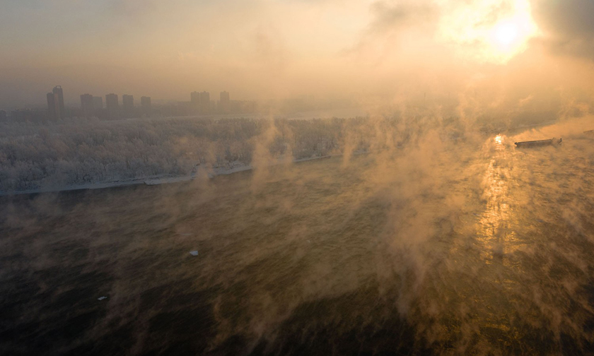 Енисей в Красноярске никогда не замерзает, даже в -50, из-за работы Красноярской ГЭС, расположенной выше по течению реки. В сильные морозы город накрывает туман от реки. Красноярск, Россия, 15 января 2022 года. Фото: Alexander Manzyuk / Anadolu Agency / Getty Images