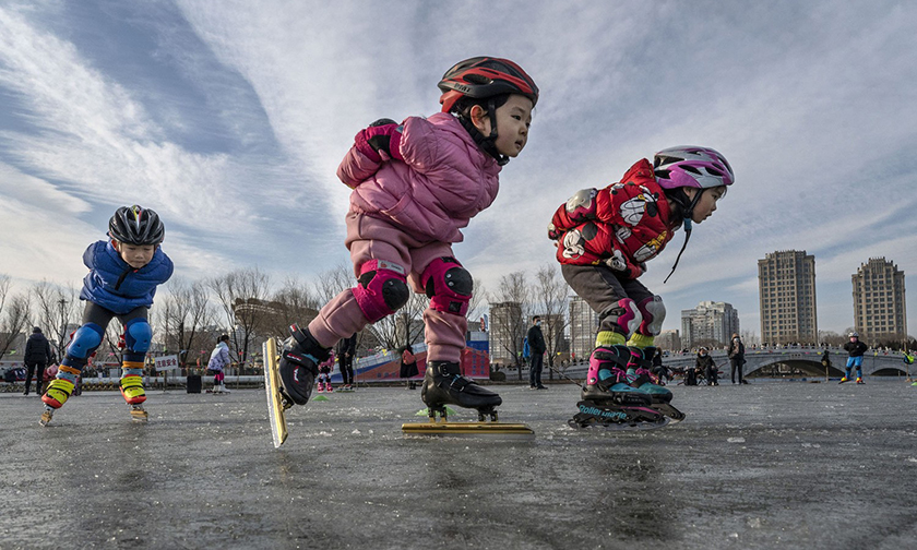 Маленькие дети на уроке по конькобежному спорту на открытом катке в пекинском парке. Благодаря Олимпийским играм популярность зимних видов спорта в Китае возросла. Пекин, Китай, 8 января 2022 года. Фото: Kevin Frayer / Getty Images