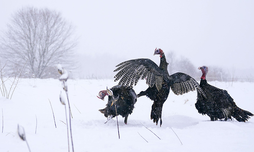 Дикие индюки во время снежной бури в Ист-Дерри, штат Нью-Хэмпшир (США) 7 января 2022 года. Фото: Charles Krupa / AP Photo