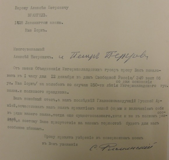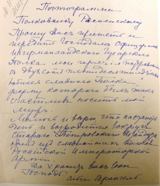 Кадровым офицером Ингерманландского полка был близкий друг Врангеля, командующий конницей Русской Армии генерал Иван Гаврилович Барбович. В этот полк главнокомандующий зачислил и своего сына — Петра Петровича. Вдова и дети генерала Врангеля до последнего вели переписку с его однополчанами — васильковыми гусарами…