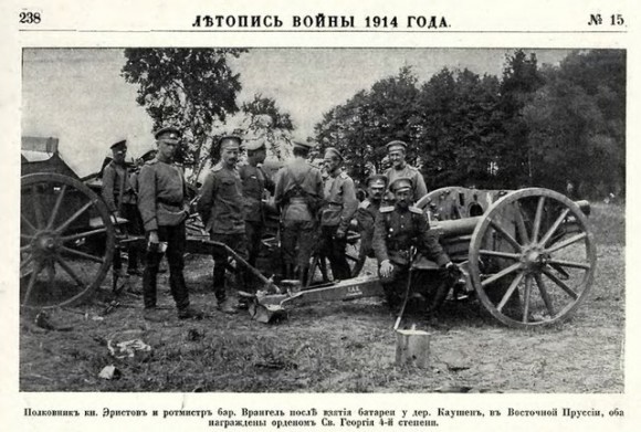Эпоха блестящих гвардейских мундиров, веселых кутежей, дуэлей и проделок закончилась в одночасье, с началом Великой войны. Буквально в первые ее дни вчерашний забияка Пипер отличился и совершил подвиг, прогремевший на всю Россию. 6 августа 1914 года во главе эскадрона в конном строю ротмистр Врангель захватил стреляющую тяжелую батарею германцев. Награждение его за этот подвиг орденом святого Георгия 4-й степени стало одним из первых в русской армии в эту войну.