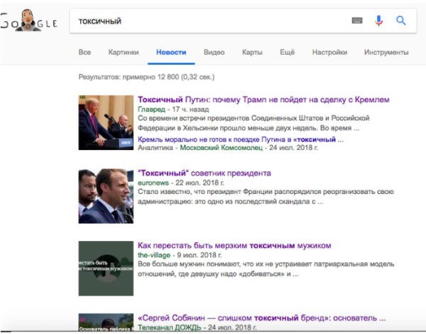 Проведите эксперимент: попробуйте набрать слово «токсичный» в Гугле и нажать на вкладку «Новости». Практически все ссылки, которые вы увидите, будут о людях, а не о веществах: токсичный Путин, токсичный советник, токсичный мужик (собирательный образ), московский мэр Собянин как «токсичный бренд».