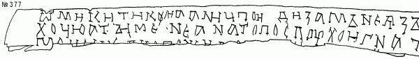 Вот другой пример. Грамота, которая найдена несколько позже, но тоже довольно давно. Тоже такой эффект: плохое состояние бересты, и понять, принадлежит ли букве штрих, не удается. Грамота сама собой замечательная по содержанию. Это письмо № 377 (номер смешным образом маленький для нынешних наших занятий), адресная формула и первая фраза которого выглядят так. Это знаменитая грамота, которую многие помнят, потому что она встречается в самых разных рассказах о жизни в древнем Новгороде. Неясные буквы обозначены подчеркиванием: