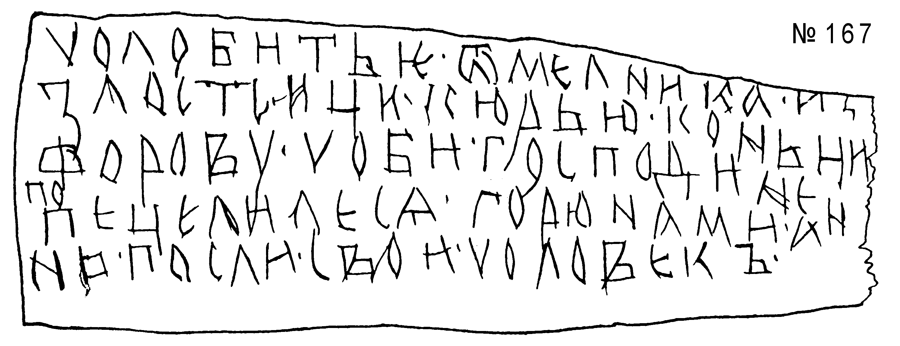 Почти все эти эпизоды касаются грамот, найденных безумно давно. Интересно, сколько десятилетий могли быть не прочитаны до конца грамоты; это очень поучительная вещь. Первая грамота, которую я вам предложу — № 167, она найдена в 1955 году. Писать ее целиком я не буду, она достаточно простая, я ее просто прочту и запишу ту часть, которая нас интересует.